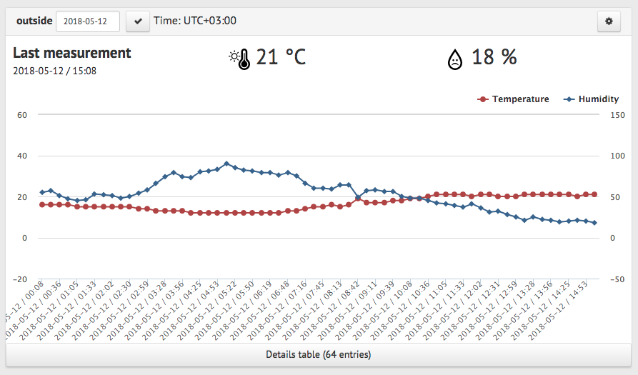 At tehybug.com site its displayed in a chart, an example chart of a TeHyBug with DHT22 sensor is below.